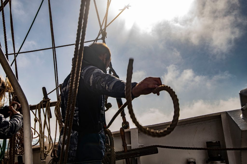 « Affalage d’urgence ! » crie maintenant le capitaine. Manoeuvre simple, mais le vent est si fort que nous devons nous jeter sur la voile de trinquette comme dans un rodéo mené par le vent. Et puis, une fois l’adrénaline passée, c’est notre patience qui va être mise à l’épreuve. Maintenant il faut tenir encore 7 heures jusqu’au port, avec l’estomac qui fait de la zumba et le Kraken qui s’essaye au twerk dans les creux de vague. La plupart tentent de dormir à l’intérieur pour économiser leurs forces, pendant qu’on se soutient sur le pont arrière autour de la barre. On se raconte des histoires, des blagues, on se tend la main quand l’équilibre nous fait défaut. L’équipage du Kraken est en train de naître, pour de vrai, dans la tempête.