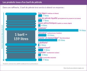 Un baril de pétrole brut (159 litres) n’est pas directement utilisable en tant que tel, il doit d’abord être raffiné afin d’en extraire l’Essence, le Gazole, le Kérozène, les Gazs, etc…