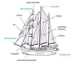 Le Kraken est une goélette à trois mâts. Dans l’ordre de la proue du bateau (avant) à la poupe (arrière), il y a le mât de Misaine, le Grand mât et le mât d’Artimon. En extension de la proue, Il y a un petit mât presque à l’horizontal qui n’est pas comptabilisé dans le calcul du gréement trois-mâts, qui s’appelle le mât de beaupré. Celui-ci supporte les étais, câbles aidant à maintenir le mât de Misaine, et les points d’amures des voiles d’avant, servant à maintenir les voiles Foc et Clin Foc au bateau.